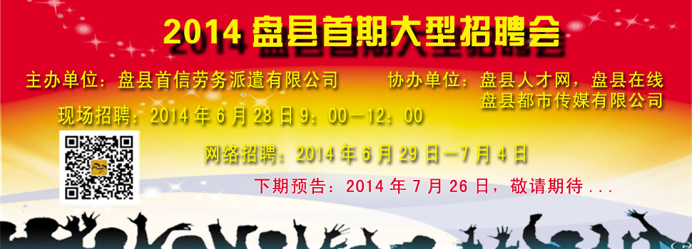 2014盤縣首屆大型招聘會(huì)由盤縣首信勞務(wù)派遣有限公司主辦,盤縣在線,盤縣人才網(wǎng)共同協(xié)辦,目的是為招聘單位和求職者搭建平臺(tái),為雙方牽線、助經(jīng)濟(jì)發(fā)展、促社會(huì)和諧。